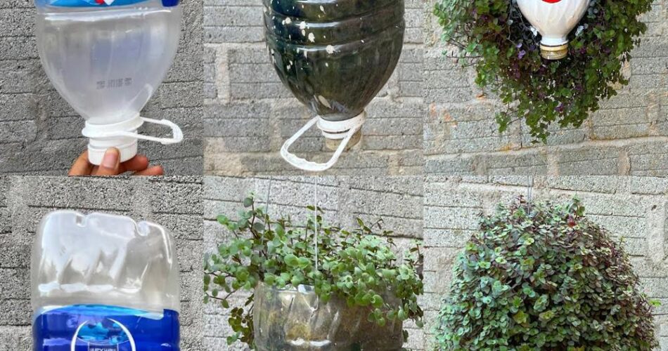 You can cut plastic bottles into two parts and assemble them to form hanging jars. Attach them with rope or hooks to create a nice vertical garden. This makes it possible to optimize space and add a green touch to your interior or exterior decoration.